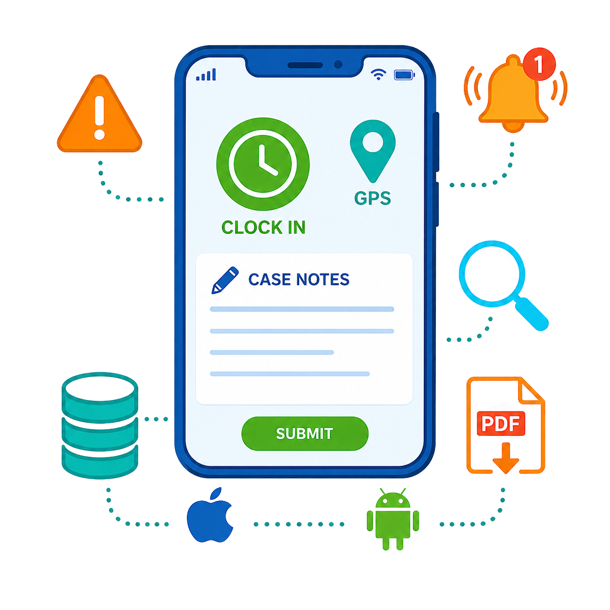 Support workers clock in and out with GPS location capture, complete shift case notes, receive push notifications, and communicate via internal chat. Available on iOS and Android.