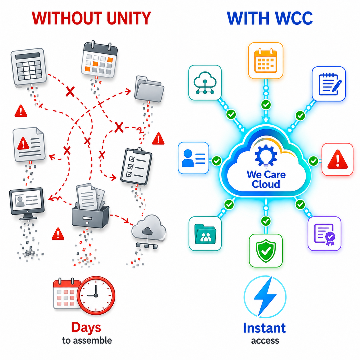 Each piece works in isolation. None of it works together. And when an auditor asks for evidence of service delivery, staff compliance, or incident management, the answer requires assembling records from six different places under pressure.