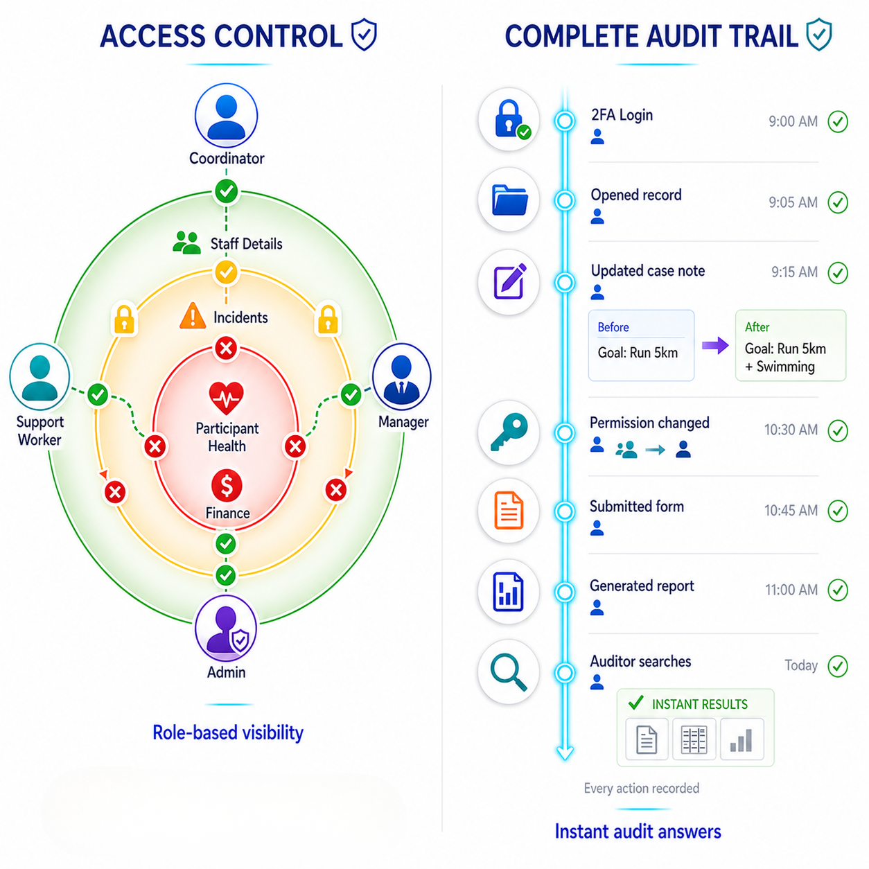 Every gap between systems is a compliance risk. Every manual handover between tools is an opportunity for a record to be incomplete, delayed, or missing entirely. When an auditor asks for shift notes from six months ago, or incident records for a specific participant, or proof that a staff member completed mandatory training, the answer cannot be "let us check a few different places."